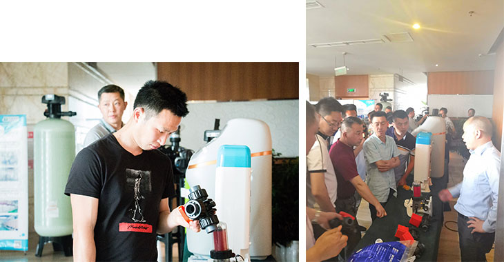 润新工作人员重点介绍了F56K控制阀、超高性价比Q系列控制阀、485端口的云管理控制阀F77W6m³/h顺流再生软化阀F130、多阀集控装置F131DN50陶瓷平面密封截止阀、过滤止回阀F132、智能防泄漏控制阀F67M以及智能防泄漏前置过滤器、厨下软水机等众多润新和润莱新产品,并着重介绍了诸多产品改进,获一致认可。