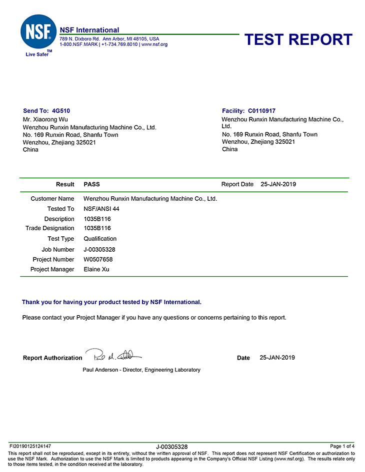 近日,润莱收到美国国家卫生基金会NSF检测报告,润莱软水机的毒理性(即材料安全性)、结构完整性(检测项目为循环压力测试、静压测试)、功能性(吸盐精度、硬度的去除)等各项指标均已通过NSF检测