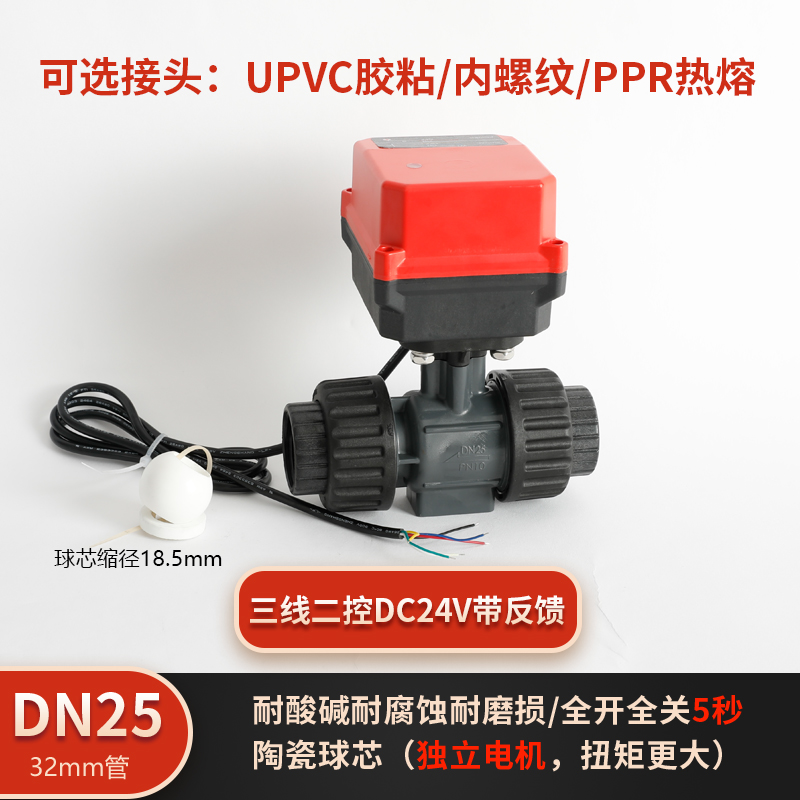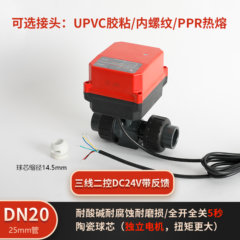 润景陶瓷芯·独立执行器三线带反馈三线DC24V塑料电动球阀DN15-DN50