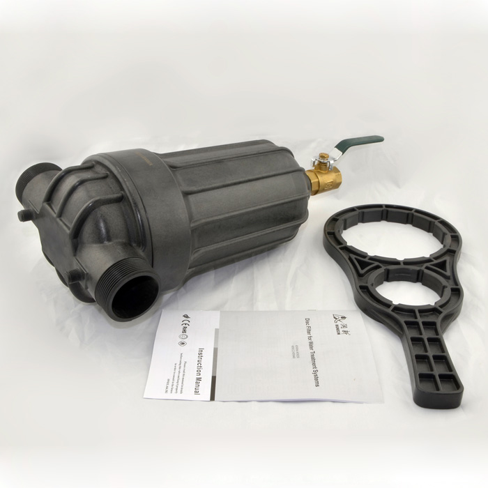 The disc filter can be divided into core and shell two parts. The core is including disc and support (ABS material). During filtration, the disc were pressed tightly, when water flow by, the foreign material was blocked in disc and grooves which realize filtration function. When the foreign material was accumulated a certain amount, open the manual ball valve on drain outlet to release the foreign material. When the pressure drop up to a certain value, filtration was stopped, open the disc filter, loosen and clean discs, finally tight it and reassemble to use.