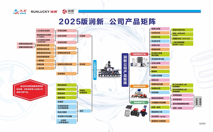 “润新阀”填补国内水处理系统用控制阀领域空白,具有密封性好、使用寿命长、可带压操作、定位方便、互换性良好、性价比高等特点,广泛应用于家用过滤/软化设备、工业过滤/软化设备、泳池过滤设备、海水淡化设备、锅炉软化水设备、农村饮用水改造、农业灌溉首部过滤系统等场合,国内给水处理领域市场占有率近八成。
