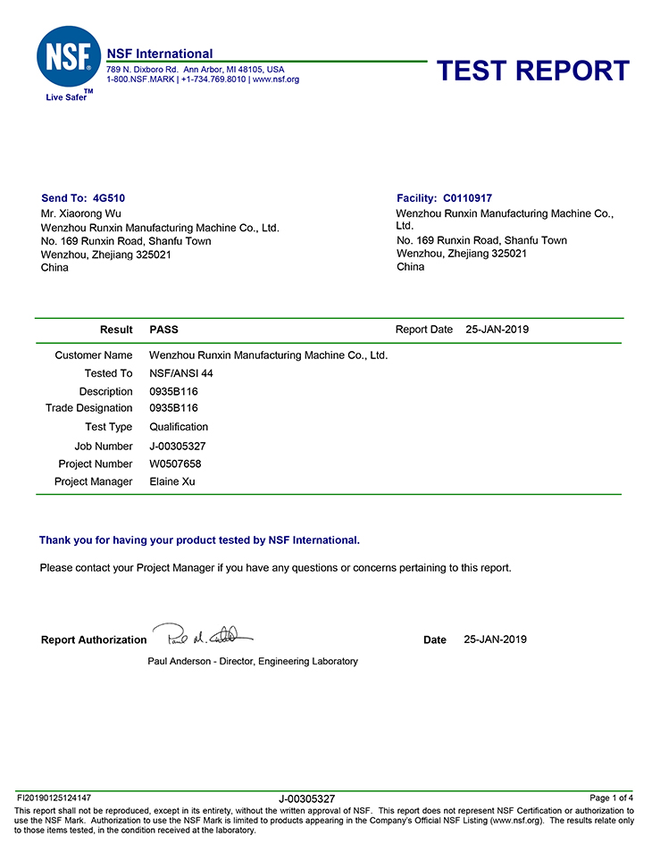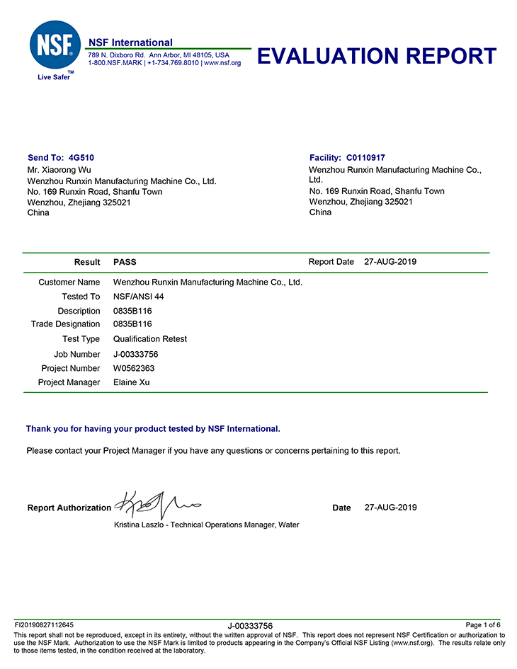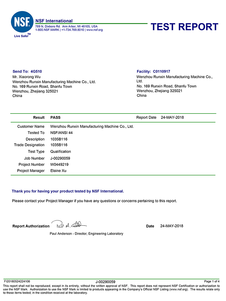 近日,润莱收到美国国家卫生基金会NSF检测报告,润莱软水机的毒理性(即材料安全性)、结构完整性(检测项目为循环压力测试、静压测试)、功能性(吸盐精度、硬度的去除)等各项指标均已通过NSF检测