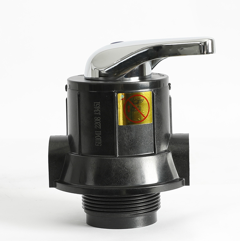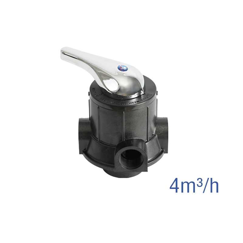 The F56A manual multiport filter valve features a flow rate of 4m³/h and utilizes a corrosion resistant gasket for opening and closing functions. It can be used as a service, backwash, and fast rinse valve, even under pressure. With a handle, you can switch the settings easily without turning off the pump or the power. When selecting a valve setting, make sure to always depress the handle before turning.